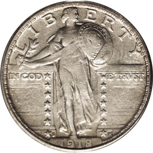 <B>1918/7-S<25C> AU50 PCGS.</B></I> Neither side of this coin reveals any sizeable or individually mentionable abrasions despite having seen some circulation. The wear that is present is light and confined to the highest points of the design, and the underdigit is still readily evident to the naked eye. Soft reddish-golden tinting has gathered on both sides of this high grade, 20th century error rarity.