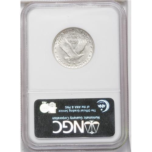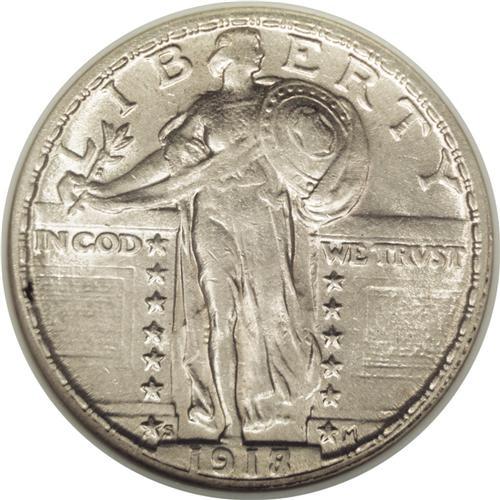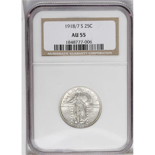<B>1918/7-S<25C> AU55 NGC.</B></I> The premier 1916 and the third-year 1918/7-S quarters will remain forever linked as early keys to the series, like so many new issues where the early emissions are rare and coveted. But while the 1916s were saved--in small numbers--at the time of issue, this overdate issue was discovered, amazingly for such a bold overdate, 19 years after the pieces were produced. Accordingly, high grade pieces are considerably more elusive than their 1916 cousins. This example boasts splendid, lustrous silver-gold surfaces with the light wear expected. The many die clashes diagnostic of the issue are plain, including the E of the motto clashed against Liberty's left (facing) knee, and the eagle's wing clashed through the T in TRUST. Census: 20 in 55, 72 finer (9/06).