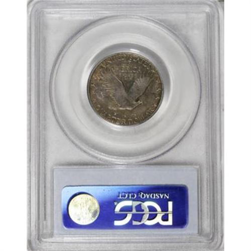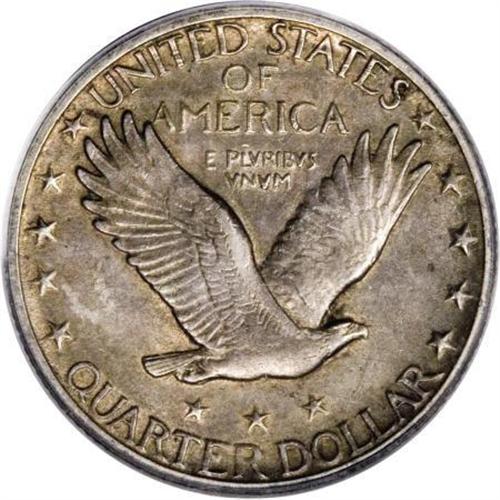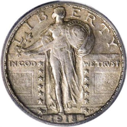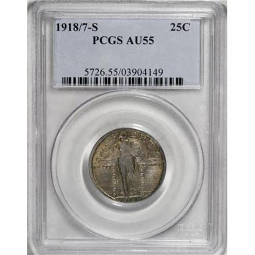 <B>1918/7-S 25C AU55 PCGS.</B></I> Breen-4235, Cline-5130, FS-101 (formerly FS-008.5). Only 45 examples of this legendary rarity have been assigned a grade of AU55 by PCGS (7/07). Furthermore, this issue is the rarest in the entire Standing Liberty quarter series in grades above AU. The overwhelming majority of survivors are well circulated for the simple reason that the variety was not recognized by numismatists until 1937, according to Breen (1988). By then most of the 1918/7-S quarters struck had seen much service in commerce and, ostensibly, sheer luck accounts for the handful of Uncirculated examples that exist today. In light of this fact, ownership of an AU specimen is a compromise met with much gratification by most collectors. But not all AU coins possess the same aesthetic qualities; some are special. The current coin, while not the finest example graded by PCGS, offers the bonus of being refreshingly original. Pleasing amber-gold toning delicately blankets both sides, with a respectable amount of luster remaining throughout. A bit weakly struck, as usual. The only mark of note is a diagonal and located above TRV of TRVST.<BR><BR><B>Coin Engraver:</B> Hermon A. MacNeil<BR><BR><b>Shipping:</b> Coins & Currency (<a target="_blank" href="http://www.heritageauctions.com/common/shipping.php">view shipping information</a>\)