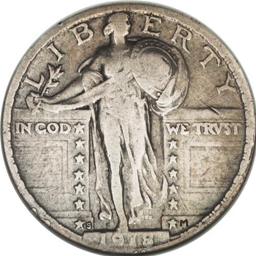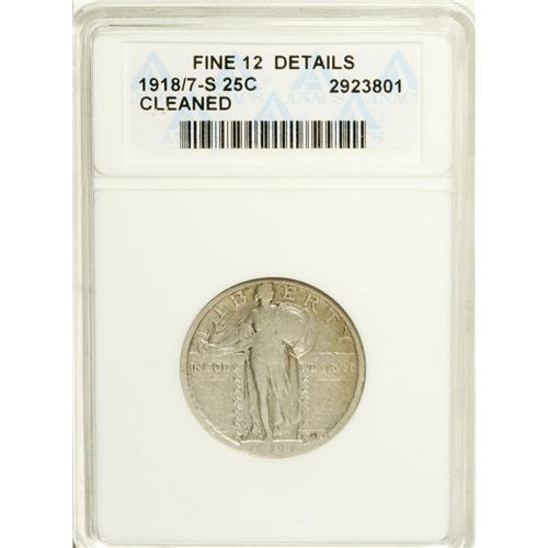 <B>1918/7-S 25C --Cleaned--ANACS. Fine 12 Details.</B></I> Light autumn-gold toning visits the upper right obverse, but most of this key date quarter is blended gunmetal-gray and powder-blue. A few small marks are distributed, and faint hairlines are visible on the reverse once it is studied beneath a loupe. The downstroke of the 7 is unmistakable within the 8 in the date.<BR><BR><b>Shipping:</b> Coin/Currency (<a target="_blank" href="http://www.heritageauctions.com/common/shipping.php">view shipping information</a>)