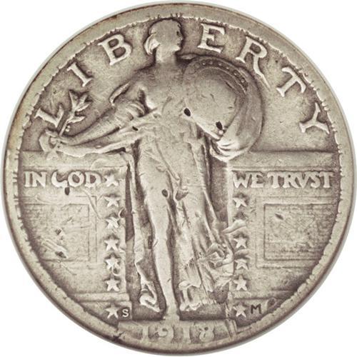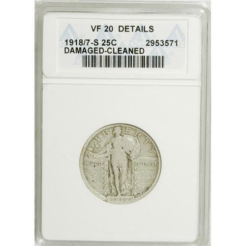 <B>1918/7-S 25C --Damaged, Cleaned--ANACS. VF20 Details.</B></I> Semi-bright silver-gray surfaces display slightly deeper gray coloration in the recesses. A few fine cleaning hairlines are visible under magnification, but the major impairment to this piece consists of six or seven deliberate punches and a few shallow scrapes on each side. Most of the coin's detail is strong, including the date, and of course, the overdate. A popular key-date variety, despite the blemishes.<BR><BR><b>Shipping:</b> Coins & Currency (<a target="_blank" href="http://www.heritageauctions.com/common/shipping.php">view shipping information</a>)