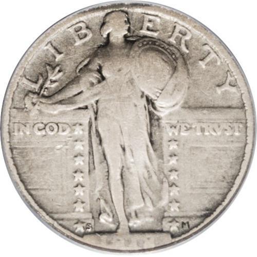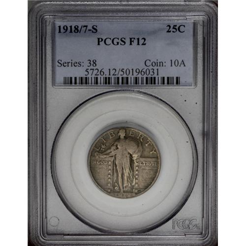 <B>1918/7-S<25C> Fine 12 PCGS.</B></I> After with all pre 1925 issues, a portion of the date shows obvious wear at the Fine level, most notably at the bases of the digits. The triangular-shaped opening in the top loop of the 8, however, ensures the overdate status of this desirable rarity. The surfaces range in color from light gray to steel-violet and show only a few minor marks on the left side of the obverse.