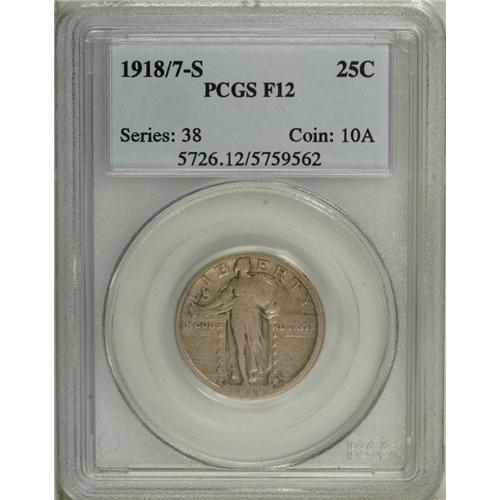 <B>1918/7-S 25C Fine 12 PCGS.</B></I> Despite 48 points of wear this remains an attractive piece, with the lower diagonal of the underdigit 7 and its upper crossbar well visible beneath the overdigit 8. Silver-gray surfaces are appealing and show only grade-consistent wear, but no mentionable distractions otherwise.<BR><BR><b>Shipping:</b> Coin/Currency (<a target="_blank" href="http://www.heritageauctions.com/common/shipping.php">view shipping information</a>)