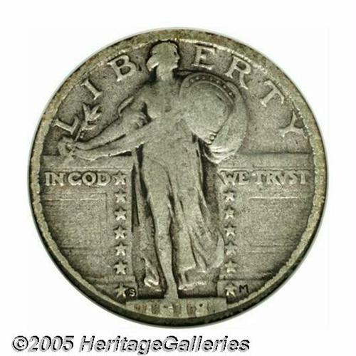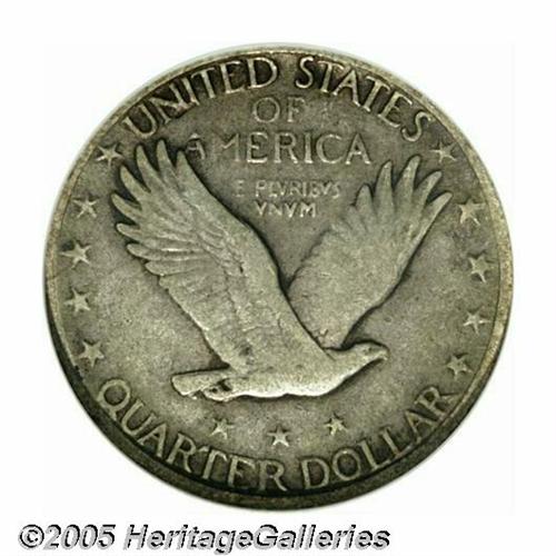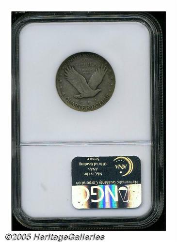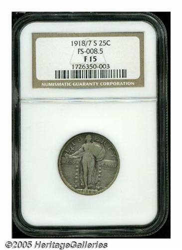 <B>1918/7-S<25C> Fine 15 NGC.</B></I> FS-008.5. This popular overdate Quarter is toned in a light to medium gray color. The underdigit is slightly blurry but visible. Other than normal circulation, this piece is very clean and relatively free of problems. A pleasing specimen for a circulated Standing Liberty Quarter set.