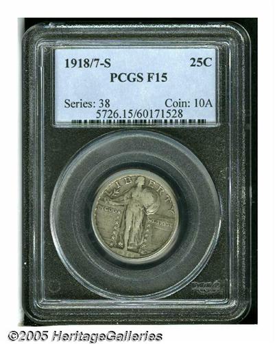 <B>1918/7-S<25C> Fine 15 PCGS.</B></I> Medium gray with full separation of the lettering from the denticles. The crossbar of the underlying 7 is clearly distinguished inside the loops of the 8. We do note a touch of roughness along the left side of the obverse.