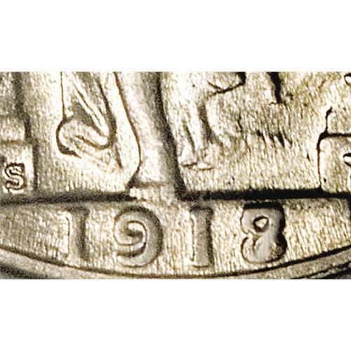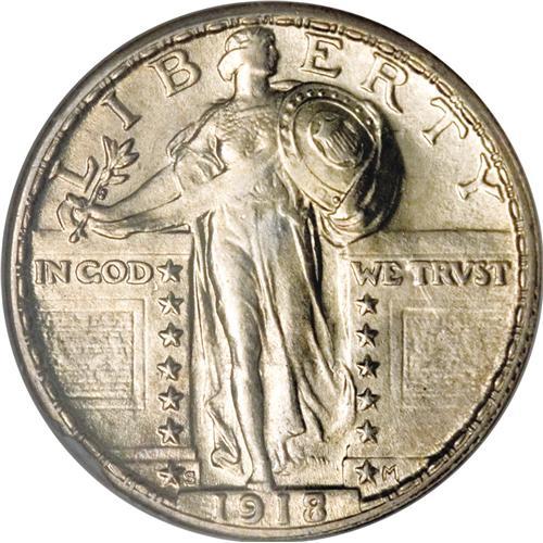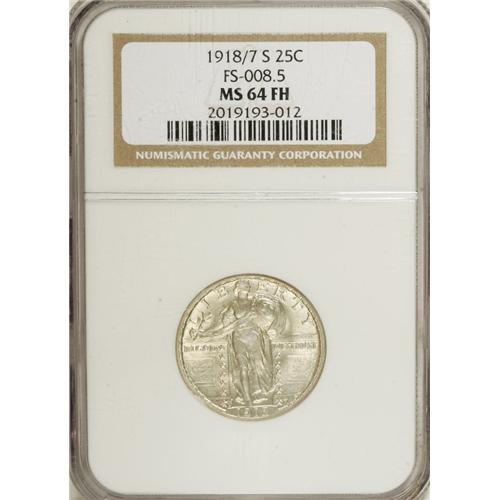 <B>1918/7-S 25C MS64 Full Head NGC.</B></I> Standing Liberty quarter pundit and commentator J.H. Cline, who recently issued his fourth edition of <I>Standing Liberty Quarters,</B></I> fittingly ranks the 1918/7-S quarter the No. 1 issue in the series in terms of both price and rarity, commenting that "A few were struck with Full Heads; about 12 pieces." This is, of course, out of the presumably small but unknown number of overdate coins that were struck. Cline comments that the overdate was created by the recutting of a 1917 die, but other commentators believe the creation was the result of a dual-hubbing error.<BR> The first appearance of the overdate quarter was in a 1937 Barney Bluestone sale, where the coin was thought to be unique. It is hard to believe that so obvious a naked-eye overdate escaped attention for nearly 20 years, but such appears to be the case. Because the overdate quarter was discovered so long after its creation, few pieces exist in Mint State, and of course even fewer with Full Head details. Authentication of this issue is mandatory, but fortunately there are some key diagnostics of genuine coins. The 7 underdigit has a slight curve, and it fills the right side of the upper loop and the middle of the lower loop of the 8. A clash from the E in the reverse motto at Liberty's right knee. There is also a die clash from the eagle's wing feather visible on the obverse, running diagonally through the first T in TRUST and into the rectangle below. The step under Liberty's right (facing) foot is missing, and usually her toes are as well. Clash marks and die polish marks also show on the reverse in the area of AME.<BR> This coin is basically brilliant, with just the slightest blush of silver-gold on each side. Three clear olive sprigs show on Liberty's headdress, and there is a clear separation between the hair and forehead. For the MS64 grade, the coin is remarkable free of abrasions of any size, large or small. Census: 5 in 64 Full Head, 0 finer (4/07).<BR><I>From The Encinitas Collection.</B></I><BR><BR><b>Shipping:</b> Coins & Currency (<a target="_blank" href="http://www.heritageauctions.com/common/shipping.php">view shipping information</a>)