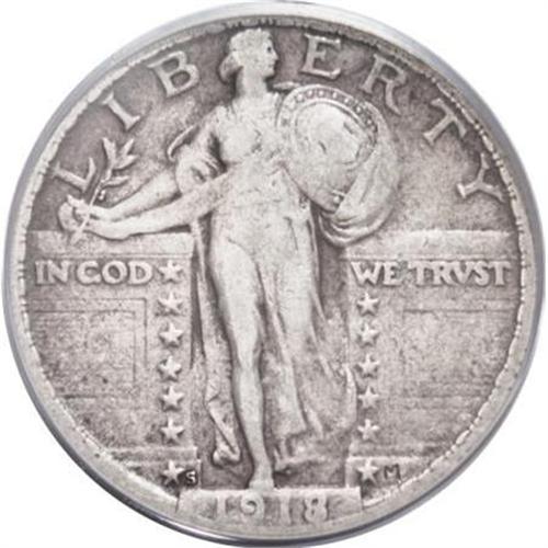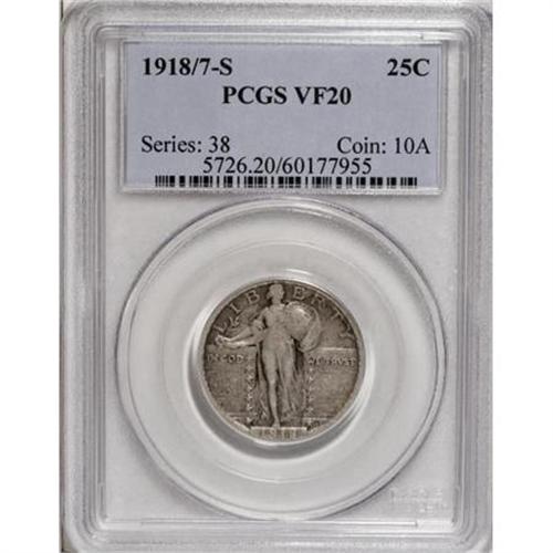 <B>1918/7-S 25C VF20 PCGS.</B></I> Light to medium gray patination runs over both sides of this popular overdate. The design elements exhibit nice detail for the grade, and the downstroke of the underdigit 7 is evident within the 8 of the date. Original, problem-free surfaces are remarkably clean for a coin that has seen light to moderate circulation. A really nice piece that will fit comfortably in a mid-grade Standing Liberty set.<BR><BR><B>Coin Engraver:</B> Hermon A. MacNeil<BR><BR><b>Shipping:</b> Coins & Currency (<a target="_blank" href="http://www.heritageauctions.com/common/shipping.php">view shipping information</a>)