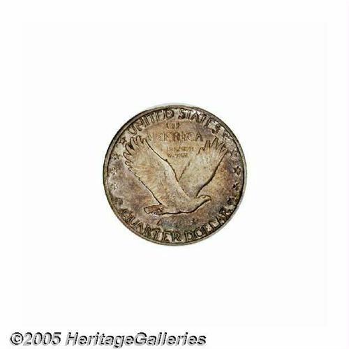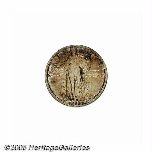 <B>1918/7-S<25C> VF30 NGC.</B></I> FS-008.5. A pleasing, mid-grade example of this key to the Standing Liberty Quarter series. Even though the date area is raised on this pre-1925 issue, the individual digits are clear as is the underdigit. Light even wear over the highpoints, some rich, antique-golden toning intermixes with magenta-red hues. A particularly attractive example.