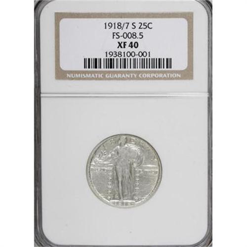<B>1918/7-S 25C XF40 NGC.</B></I> FS-008.5. The underdigit is conspicuous on this popular quarter. Bright untoned surfaces exhibit sharp definition, and possess just a few minor circulation marks. A nice addition to a higher circulated collection of Standing Liberty quarters. <BR><BR><B>Coin Engraver:</B> Hermon A. MacNeil<BR><BR><b>Shipping:</b> Coins & Currency (<a target="_blank" href="http://www.heritageauctions.com/common/shipping.php">view shipping information</a>)