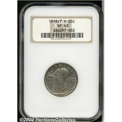 <B>1918/7-S<25C> XF40 NGC.</B></I> A pleasing example of this very popular overdate quarter variety with deep champagne toning. The reverse has additional splashes of deep steel toning. Light wear is visible on the highest points. This appears to be very sharply struck except where the detail is obscured by the wear. The overdate features are very nicely defined. Small marks to the left and right of Liberty's knee are clash marks from parts of E PLURIBUS UNUM. <BR><BR><B>Important notice:</B> Heritage usually auctions material at the rate of 200-250 lots per hour. On some occasions eBay Live bid software or the Internet may not be able to keep up with the pace of the auction. We recommend placing a realistic absentee bid now as insurance to avoid disappointment. Occasionally the auctioneer may eliminate or reject an eBay Live bid, and the auctioneer may also reopen a lot after the close of the eBay live bidding (usually because we missed an audience bid), and may reject your bid even if it shows you as the winning bidder. By bidding via eBay Live, you agree that Heritage may award the lot to another bidder at its sole discretion under the circumstances described above or any other reasonable circumstances. Since eBay bids are not shown to us until we open the lot on the floor, we treat those bids just like floor bids. In most cases the floor responds before the eBay bid is presented to us, due to Internet lag time, so for consistency we have made it a policy that floor bids are always considered first over tie eBay live bids. Also please note that all Heritage lots purchased through eBay Live carry a 20% Buyer's Premium. Please make sure you read the Terms and Conditions before you bid. </span></font></tr></table></td></tr></table>