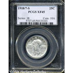 <B>1918/7-S<25C> XF45 PCGS.</B></I> This variety is one of an elite group of 20th-century overdates in American numismatics. Others in this subset include the 1914/3, 1918/7-D and 1943/2 nickels, the 1942/1 and 1942/1-D dimes, the 1901/0-S half eagle, and the 1909/8 double eagle. A few others may be awaiting discovery. This overdate quarter dollar variety is usually seen well-circulated with the specimen offered here being an attractive, high-quality circulated example. This overdate has light silvery gray surfaces with faint abrasions as expected for the grade. <BR><BR><B>Important notice:</B> Heritage usually auctions material at the rate of 200-250 lots per hour. On some occasions eBay Live bid software or the Internet may not be able to keep up with the pace of the auction. We recommend placing a realistic absentee bid now as insurance to avoid disappointment. Occasionally the auctioneer may eliminate or reject an eBay Live bid, and the auctioneer may also reopen a lot after the close of the eBay live bidding (usually because we missed an audience bid), and may reject your bid even if it shows you as the winning bidder. By bidding via eBay Live, you agree that Heritage may award the lot to another bidder at its sole discretion under the circumstances described above or any other reasonable circumstances. Since eBay bids are not shown to us until we open the lot on the floor, we treat those bids just like floor bids. In most cases the floor responds before the eBay bid is presented to us, due to Internet lag time, so for consistency we have made it a policy that floor bids are always considered first over tie eBay live bids. Also please note that all Heritage lots purchased through eBay Live carry a 20% Buyer's Premium. Please make sure you read the Terms and Conditions before you bid. </span></font></tr></table></td></tr></table>