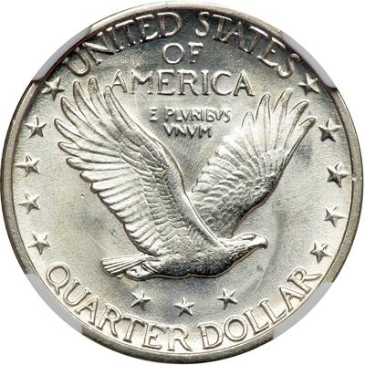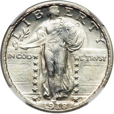 1918/7-S Liberty Standing Quarter Dollar. NGC graded MS-65. A splendid white gem specimen of this classic 20th century rarity. The intense satiny mint luster makes this example remarkable. Within the Standing Liberty quarter series there are expensive issues that show up from time to time (we all know which ones those are) but none is quite as famous as the most illustrious issue of them all: the Overdate 1918-S.