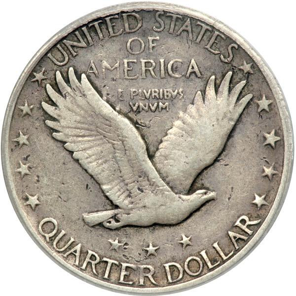 1918/7-S Liberty Standing Quarter Dollar. PCGS graded VF-30. CAC Approved. A great rarity of the last century. Few overdates were created in the 20th century, and all are eagerly sought by collectors. Perhaps a thousand of these 1918-S, 8 over 7 quarter dollars exist, the grading services have seen about half that number, and it is likely that more are hidden away or sitting in albums, having been acquired decades ago. This one has the minute features noted in the Breen Encyclopedia. The overdate feature is plain with a glass. Apparently in the rush to get dies ready, one 1918 die received a blow from the 1917 master hub, then the hub was switched to the 1918 hub, and the die was struck again. No one noticed (or cared) that is had the overdate, and the die was shipped and put into production at the San Francisco Mint, much to the delight of collectors (PCGS # 5726) .