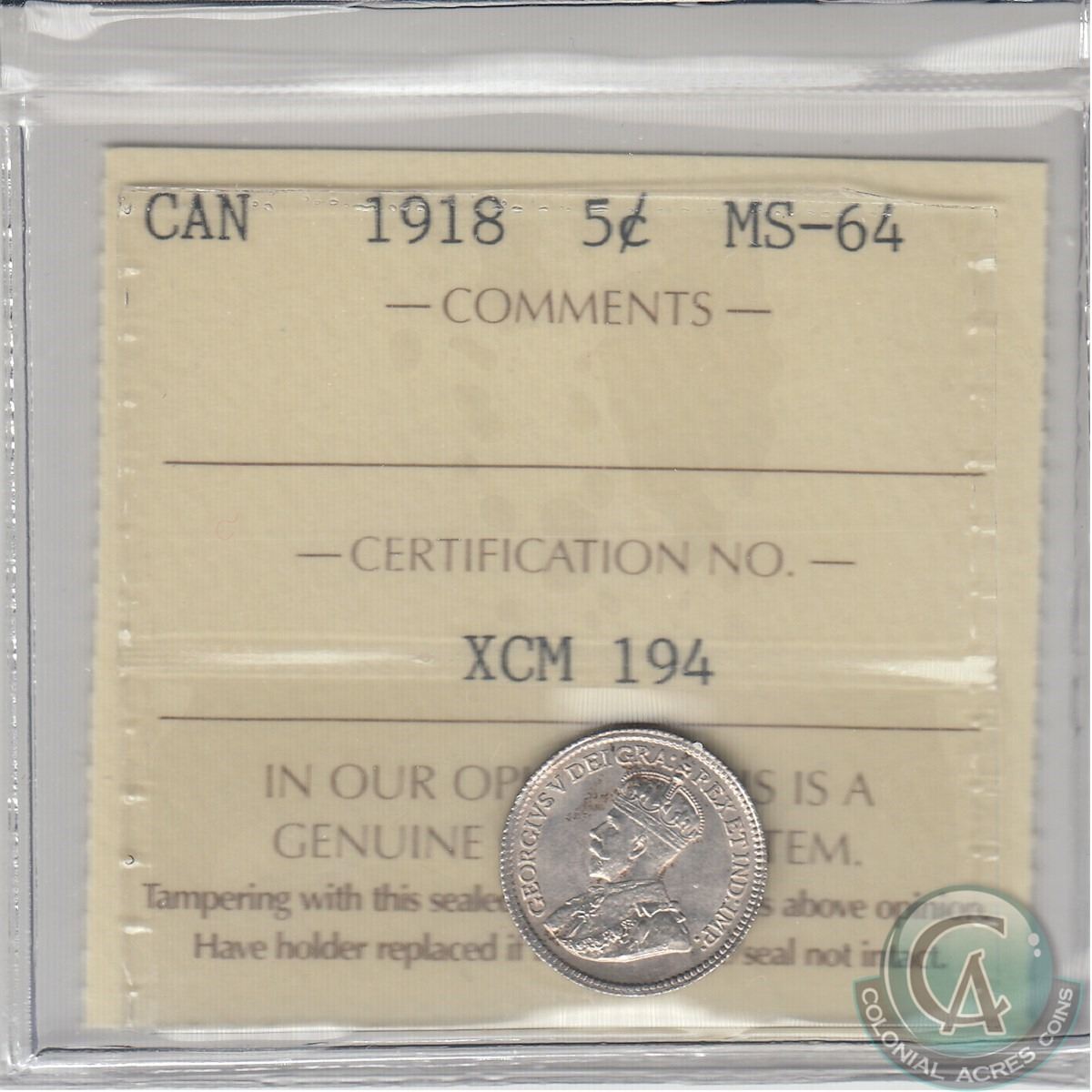 1918 Canada 5-cent ICCS Certified MS-64