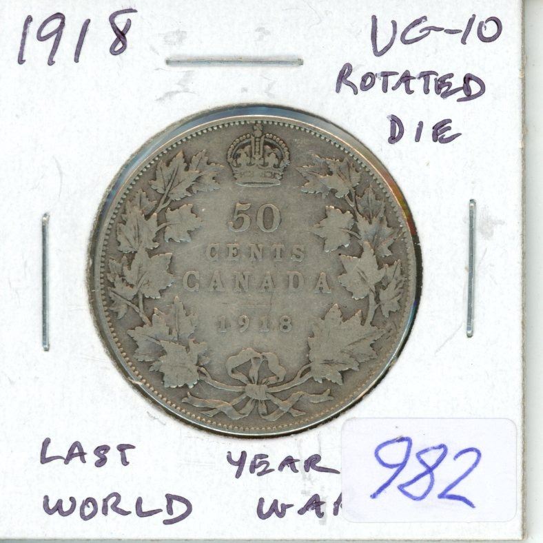 1918 Canadian Silver 50 Cents. Issued during the last year of World War I. VG-10 with Rotated Die.