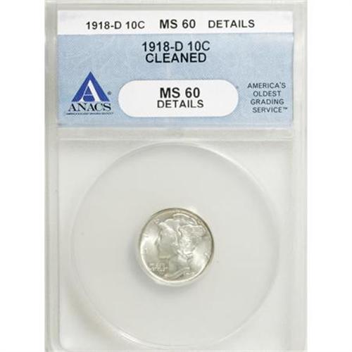 <B>1918-D 10C --Cleaned--ANACS. MS60 Details.</B></I> NGC Census: (0/276). PCGS Population (5/339). Mintage: 22,674,800. Numismedia Wsl. Price for NGC/PCGS coin in MS60: $90. (#4918)<BR><BR><B>Coin Engraver:</B> Adolph A. Weinman<BR><BR><b>Shipping:</b> Coins & Currency (<a target="_blank" href="http://www.heritageauctions.com/common/shipping.php">view shipping information</a>)