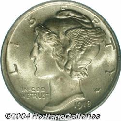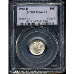 <B>1918-D<10C> MS64 Full Bands PCGS.</B></I> Pale gold toning graces the surfaces of the lovely dime. Every design facet is strongly detailed, including of course, the all important full bands feature on the reverse. Although a few finer examples have been certified, this is sure to please the collector of sharply struck Mint State Mercury dimes. <BR><BR><B>Important notice:</B> Heritage usually auctions material at the rate of 200-250 lots per hour. On some occasions eBay Live bid software or the Internet may not be able to keep up with the pace of the auction. We recommend placing a realistic absentee bid now as insurance to avoid disappointment. Occasionally the auctioneer may eliminate or reject an eBay Live bid, and the auctioneer may also reopen a lot after the close of the eBay live bidding (usually because we missed an audience bid), and may reject your bid even if it shows you as the winning bidder. By bidding via eBay Live, you agree that Heritage may award the lot to another bidder at its sole discretion under the circumstances described above or any other reasonable circumstances. Since eBay bids are not shown to us until we open the lot on the floor, we treat those bids just like floor bids. In most cases the floor responds before the eBay bid is presented to us, due to Internet lag time, so for consistency we have made it a policy that floor bids are always considered first over tie eBay live bids. Also please note that all Heritage lots purchased through eBay Live carry a 20% Buyer's Premium. Please make sure you read the Terms and Conditions before you bid.