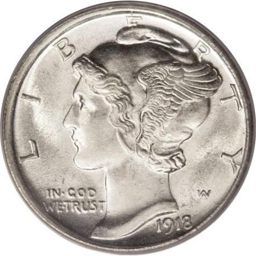 <B>1918-D 10C MS64 Full Bands PCGS.</B></I> Lustrous and untoned, with well preserved surfaces that are blemish-free. A small charcoal spot is noted near the lower obverse rim, below 18 in the date. The importance of this piece derives from the fully split central bands on the reverse, a condition rarely seen on 1918-D dimes. Population: 79 in 64 Full Bands, 18 finer (6/07). <BR><BR><b>Shipping:</b> Coins & Currency (<a target="_blank" href="http://www.heritageauctions.com/common/shipping.php">view shipping information</a>)