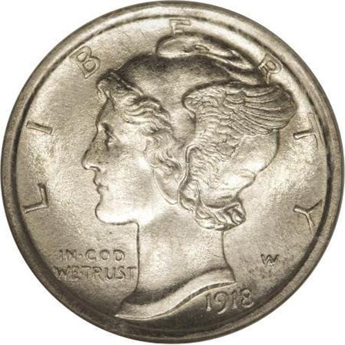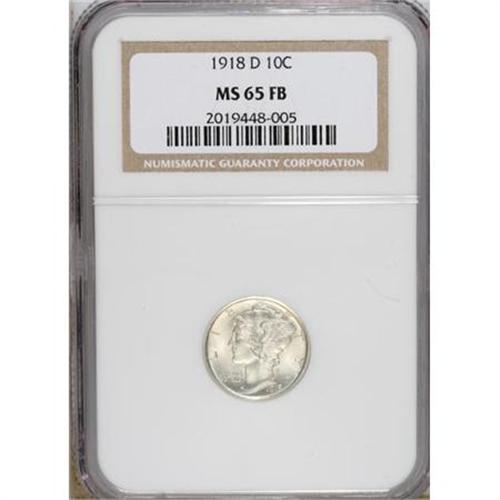<B>1918-D 10C MS65 Full Bands NGC.</B></I> Even though more than 22 million pieces were struck, the 1918-D is generally acknowledged today as the most challenging strike rarity in the Mercury dime series, probably as a result of hurried wartime conditions. Gems are very elusive and plagued by peripheral weakness, which is accompanied by indistinct center bands on all but a few of the Uncirculated population. The current specimen is a notable exception. Its design elements are sharply struck throughout, not just on the bands. Excellent definition is seen in the peripheral lettering (save for minor softness on the base of E in ONE), in the numerals of the date, and in the mintmark. The surfaces have a grainy-textured appearance with soft, glowing luster, and are nearly untoned, except for a whisper of gold color in limited areas. There are no obvious or distracting blemishes on either side of this exceptional coin. Census: 7 in 65 Full Bands, 1 finer (7/07).<BR><BR><B>Coin Engraver:</B> Adolph A. Weinman<BR><BR><b>Shipping:</b> Coins & Currency (<a target="_blank" href="http://www.heritageauctions.com/common/shipping.php">view shipping information</a>\)
