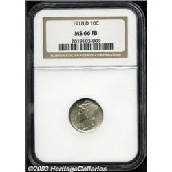 1918-D 10C MS66 Full Bands NGC. Like its Philadelphia Mint counterpart, the 1918-D is often encountered with peripheral striking weakness. Very slight evidence of this is noted on this piece on several of the letter tops of STATES on the reverse. But that is a minor consideration when one considers the overall rarity of this issue in Gem grades and with full band definition. The 1918-D is arguably the rarest Denver Mint dime with full bands in the Mercury series with only a handful certified in lower grades. This remarkable Gem that shows complete separation of the center bands, is tied with one other at NGC and one at PCGS as the finest known (11/03). Both sides are covered with a light, even layer of golden-gray patina that only adds to the attractiveness and originality of this early Mercury rarity. For pedigree purposes, a couple of small milling marks are noted near the top of Liberty's cap. Important notice: Heritage usually auctions material at the rate of 200-250 lots per hour. On some occasions eBay Live bid software or the Internet may not be able to keep up with the pace of the auction. We recommend placing a realistic absentee bid now as insurance to avoid disappointment. Occasionally the auctioneer may eliminate or reject an eBay Live bid, and the auctioneer may also reopen a lot after the close of the eBay live bidding (usually because we missed an audience bid), and may reject your bid even if it shows you as the winning bidder. By bidding via eBay Live, you agree that Heritage may award the lot to another bidder at its sole discretion under the circumstances described above or any other reasonable circumstances. Also please note that all Heritage lots purchased through eBay Live carry a 20% Buyer's Premium. Please make sure you read the Terms and Conditions before you bid.