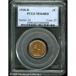 <B>1918-D 1C MS64 Red PCGS.</B></I> Sharply struck, with lustrous surfaces overlain with coppery-gold patina. A few small flecks are scattered over the obverse. Population: 89 in 64, 34 finer (1/05). Lot:5449