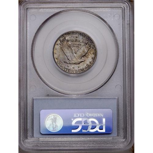 <B>1918-D<25C> MS63 Full Head PCGS.</B></I> Bright satiny luster illuminates the attractively toned surfaces. Green-gold and cerise dominate the obverse, while the reverse offers steel-blue patina with darker toning at the upper rim. Other iridescent hues include speckled khaki-green, apricot, and russet-red. A faint die crack (as struck) extends through 918, but no contact marks or other detractors seem evident on either side of the piece. The strike is sharp on all but a couple of rivets.