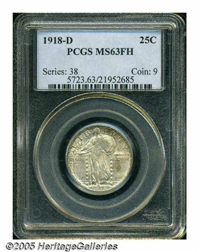 <B>1918-D<25C> MS63 Full Head PCGS.</B></I> The surfaces of this satiny Mint State example seem entirely free of marks, however small, and the pleasing if mild luster produces a slightly reflective sheen on either side of the coin. Attractive speckled patina enhances the overall eye appeal of the piece, appearing primarily in the fields and near the obverse and reverse peripheries. Minor striking weakness on the shield, and on the date, seems to limit the grade assessment.