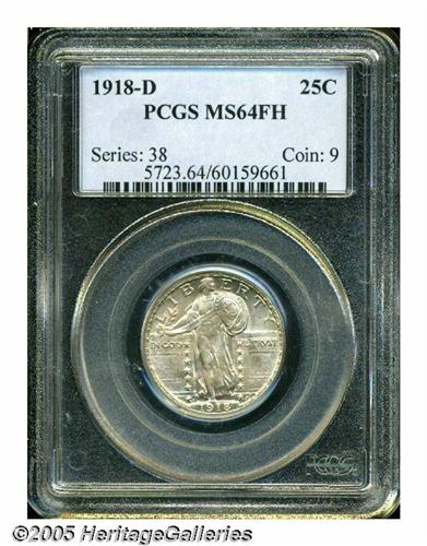 <B>1918-D<25C> MS64 Full Head PCGS.</B></I> Boldly struck with pleasing satin luster, lovely light toning, and smooth, blemish-free surfaces. Somewhat weakly struck on Liberty's shield, and on the eagle, preventing a higher grade assessment. Population: 96 in 64 Full Head, 51 finer (4/05).