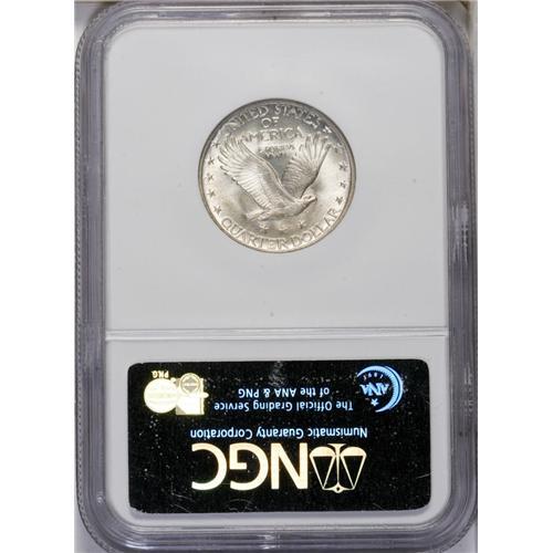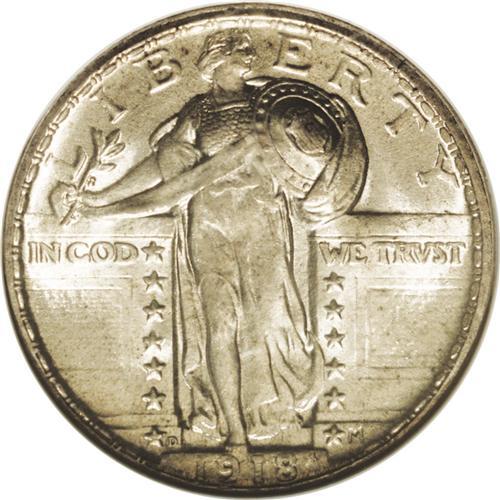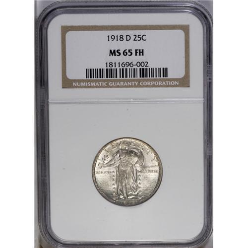 <B>1918-D<25C> MS65 Full Head NGC.</B></I> The '18-D is one of the lesser-known scarcities in the Standing Liberty quarter series. It is usually very softly impressed in the center of the obverse, and is quite elusive with full head detail. The total number of certified Full Head Gems is currently 105 at NGC, and 116 at PCGS (6/06). The luster on this piece is full, satiny, and very lightly toned. An interesting die crack extends through all four digits in the date. Excellent preservation has left the piece free of even small marks.