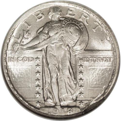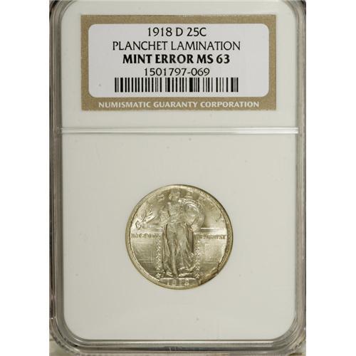 <B>1918-D 25C Standing Liberty Quarter--Planchet Lamination--MS63 NGC.</B></I> This lustrous and lightly toned example is surprisingly unabraded for the MS63 grade. The strike is a bit soft on the head and the date, but the overall appearance is crisp. A hinged lamination is present at 5 o'clock on the obverse, and a second hinged lamination is opposite at 1 o'clock. Error Uncirculated Standing Liberty quarters are rare, and it is remarkable to find a piece with a hinged lamination on each side.<BR><BR><b>Shipping:</b> Coins & Currency (<a target="_blank" href="http://www.heritageauctions.com/common/shipping.php">view shipping information</a>)
