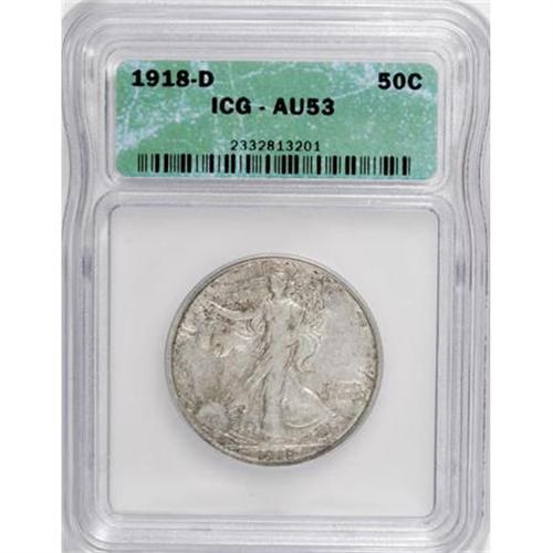 <B>1918-D 50C AU53 ICG.</B></I> NGC Census: (8/406). PCGS Population (15/497). Mintage: 3,853,040. Numismedia Wsl. Price for NGC/PCGS coin in AU53: $450. (#6575)<BR><BR><B>Coin Engraver:</B> Adolph A. Weinman<BR><BR><b>Shipping:</b> Coins & Currency (<a target="_blank" href="http://www.heritageauctions.com/common/shipping.php">view shipping information</a>\)
