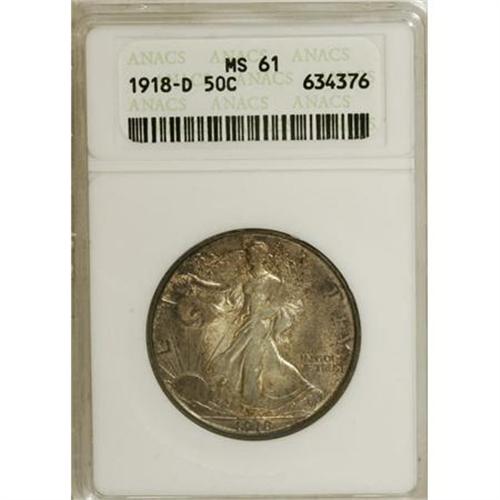 <B>1918-D 50C MS61 ANACS.</B></I> Luminous and unworn with rich tan and amber patina over all but the centers, which remain silver-gray. This well struck D-mint piece exhibits a degree of contrast on the branch hand.<BR><BR><B>Coin Engraver:</B> Adolph A. Weinman<BR><BR><b>Shipping:</b> Coins & Currency (<a target="_blank" href="http://www.heritageauctions.com/common/shipping.php">view shipping information</a>)