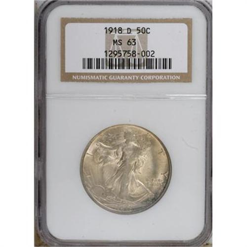 <B>1918-D 50C MS63 NGC.</B></I> This is a lovely, satiny example with attractive light toning and nicely preserved surfaces. Just two to three minor marks are noted near the center of each side. The striking detail is typically soft on Liberty's head, branch hand, and skirt lines, as well as on the eagle's right (facing) leg. This issue is scarce at the Select Mint State level, and becomes increasingly elusive any finer. <BR><BR><b>Shipping:</b> Coins & Currency (<a target="_blank" href="http://www.heritageauctions.com/common/shipping.php">view shipping information</a>)