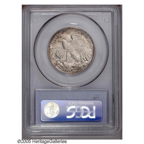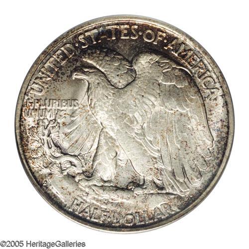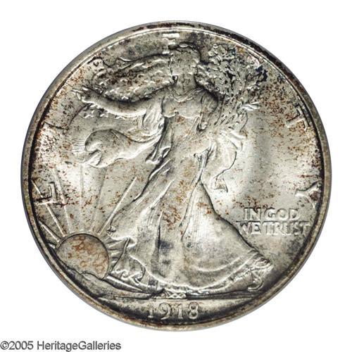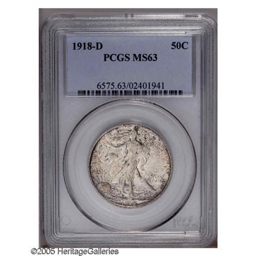 <B>1918-D<50C> MS63 PCGS.</B></I> Atypically lustrous with above-average sharpness over the central devices. Speckled russet and violet toning gravitates to the borders.
