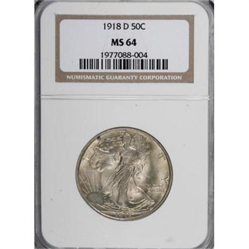 <B>1918-D 50C MS64 NGC.</B></I> Beginning in 1918 and continuing for almost 10 years, the Denver mint had a practice of lengthening die life by setting the dies further apart than optimal. This undoubtedly worked, but the resultant coins almost universally lack highpoint definition. That is the case for the 1918-D half also; however, this particular piece shows uncharacteristically strong central details. The mint luster is strong and frosted, and each side shows just the slightest accent of light golden-rose color. <BR><BR><B>Coin Engraver:</B> Adolph A. Weinman<BR><BR><b>Shipping:</b> Coins & Currency (<a target="_blank" href="http://www.heritageauctions.com/common/shipping.php">view shipping information</a>)