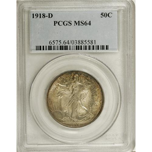 <B>1918-D 50C MS64 PCGS.</B></I> An issue from the first year that all mintmarks were on the reverse. The predominantly smoke-gray surfaces yield to lighter silver-gray at the center highpoints of each side, with a touch of amber-gold at the obverse rim. A true condition rarity, seldom seen in the higher Mint State grades. PCGS has certified only 29 coins finer (4/07).<BR><BR><b>Shipping:</b> Coins & Currency (<a target="_blank" href="http://www.heritageauctions.com/common/shipping.php">view shipping information</a>)