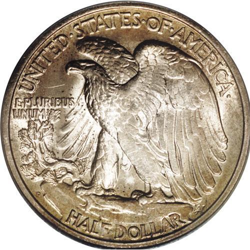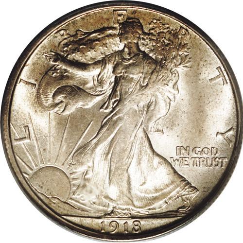 <B>1918-D<50C> MS64 PCGS.</B></I> In addition to an absolute scarcity, the 1918-D is also a strike rarity among early Walkers. This piece shows the usual softness in the center of each side. The coin displays lovely mint luster and there is an even layer of golden-brown toning over both obverse and reverse.