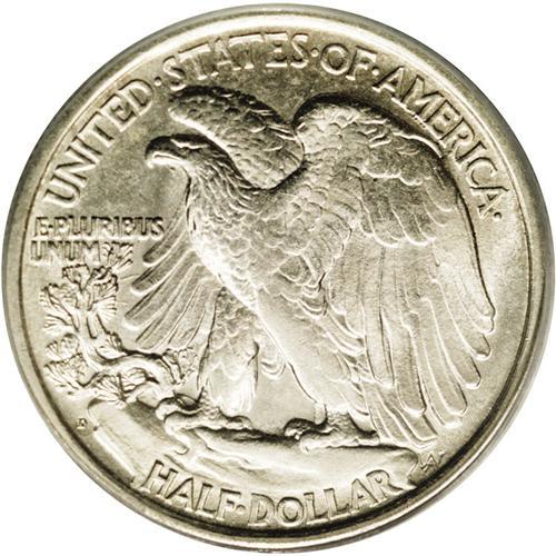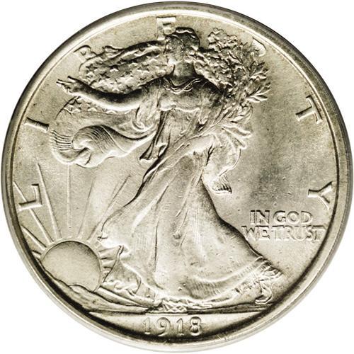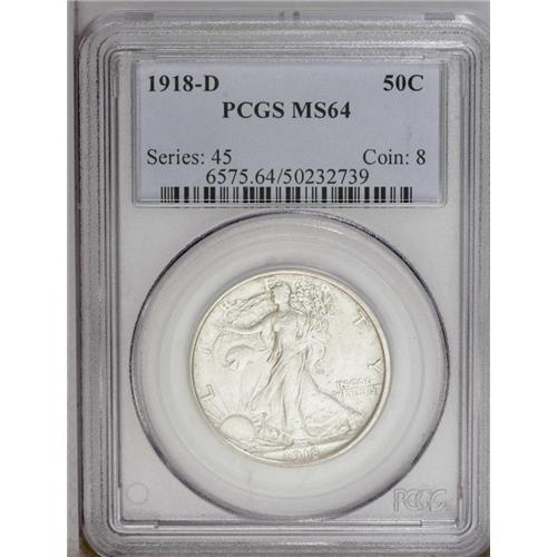 <B>1918-D<50C> MS64 PCGS.</B></I> The 1918-D is a condition rarity among early Walkers and is seldom seen above MS63. This piece is close to Gem quality with fully brilliant silver surfaces and satiny luster. The central obverse has somewhat weaker detail than the rest of the coin. The hand across Liberty's body, as well as her head, have only minimal detail.