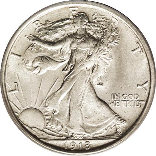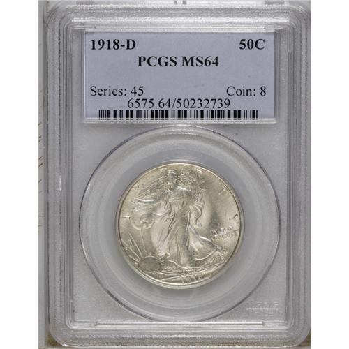 <B>1918-D 50C MS64 PCGS.</B></I> The 1918-D is a condition rarity among early Walkers and is seldom seen above MS63. This piece is close to Gem quality, with satiny luster and scattered speckles of light tan-gray color. The central obverse has somewhat weaker detail than the rest of the coin. The grade is defined by a few light handling marks. PCGS has graded only 29 specimens at the Gem grade level (10/06).<BR><BR><b>Shipping:</b> Coin/Currency (<a target="_blank" href="http://www.heritageauctions.com/common/shipping.php">view shipping information</a>)
