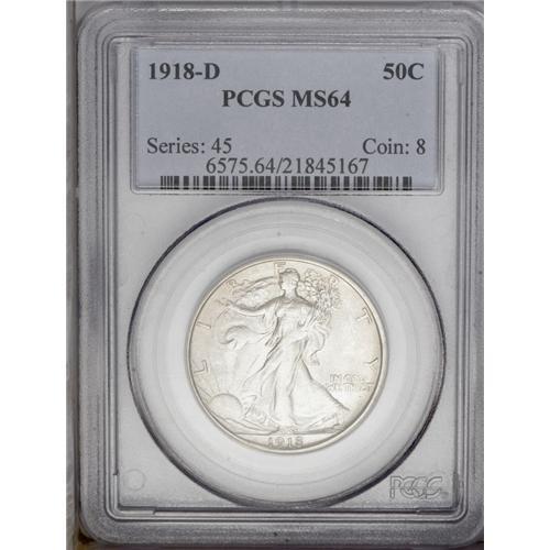 <B>1918-D<50C> MS64 PCGS.</B></I> The 1918-D is a scarcer issue among early Walkers even though 3.8 million pieces were produced. High grade examples such as this piece are very elusive and rarely encountered any finer. Thick mint luster rolls around each side with a lightly toned appearance. Just a few minimal abrasions are noted in the right obverse field that serve to limit the grade.