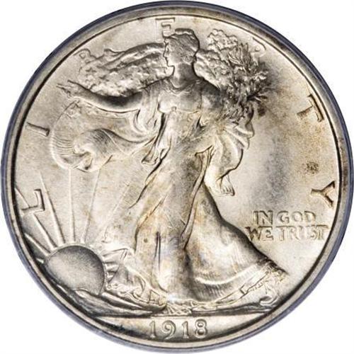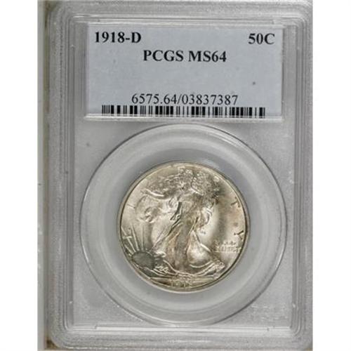 <B>1918-D 50C MS64 PCGS.</B></I> Radiant luster shines through a thin coat of champagne-gold and powder-blue color accented with a wisp or two of lilac. The centers and upper gown lines are weakly struck, which is typical for the issue. There are fewer marks than what might be expected for the grade designation.<BR><BR><B>Coin Engraver:</B> Adolph A. Weinman<BR><BR><b>Shipping:</b> Coins & Currency (<a target="_blank" href="http://www.heritageauctions.com/common/shipping.php">view shipping information</a>)