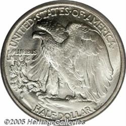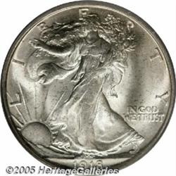 <B>1918-D 50C MS65 PCGS.</B></I> This third year issue's mintage of over 3.8 million pieces belies its extreme scarcity in Gem and better condition. The nearly untoned surfaces offer excellent sharpness over the central devices and display a bright, satiny sheen throughout. Signs of contact are both well scattered and inconsequential. Population: 25 in 65, 3 finer (2/05).