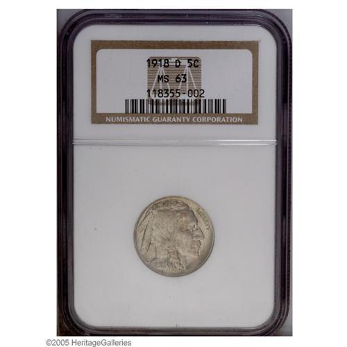 1918-D 5C MS63 NGC. Subtle grayish-tan color overlays 1918-D[5C] MS63 NGC.