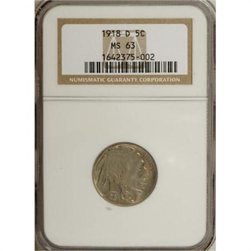 <B>1918-D 5C MS63 NGC.</B></I> Despite a touch of softness on the braid and shoulder, this luminous Select representative has above-average definition for the issue. The lightly abraded surfaces of this D-mint nickel display lovely gold and pink toning.<BR><BR><B>Coin Engraver:</B> James E. Fraser<BR><BR><b>Shipping:</b> Coins & Currency (<a target="_blank" href="http://www.heritageauctions.com/common/shipping.php">view shipping information</a>)