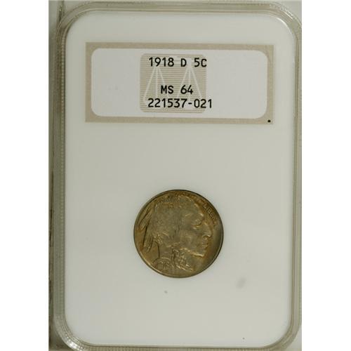 <B>1918-D 5C MS64 NGC.</B></I> A medley of olive-green, gold, and pink color cover lustrous surfaces that are free of significant marks. Generally well struck on the motifs.<BR><BR><b>Shipping:</b> Coin/Currency (<a target="_blank" href="http://www.heritageauctions.com/common/shipping.php">view shipping information</a>)