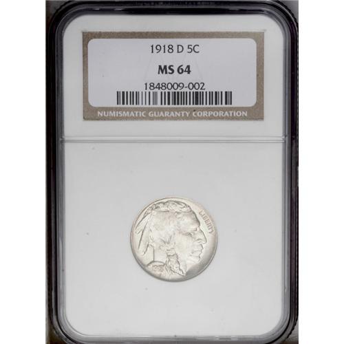 <B>1918-D<5C> MS64 NGC.</B></I> The strike is reasonably sharp for this difficult D-mint, which exhibits gray satin luster with rose undertones. An interesting die crack is noted on the obverse that extends along the lower edge of the Y in LIBERTY and tails out into the adjoining field area. A wispy pinscratch nearly bisects the bison's shoulder, but any other surface marks are absent.