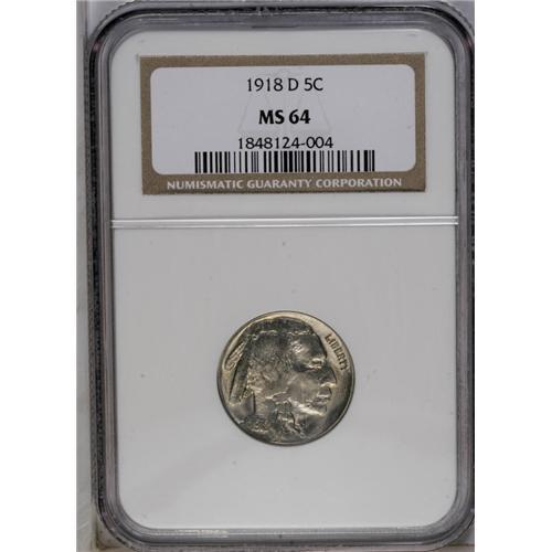 <B>1918-D<5C> MS64 NGC.</B></I> This example is the typical Choice Mint State 1918-D nickel with intensely lustrous surfaces and pale gold toning. The central obverse and reverse have considerable weakness, yet all other aspects suggest a Gem quality coin. A die crack crosses the bison's tail and hind quarter.