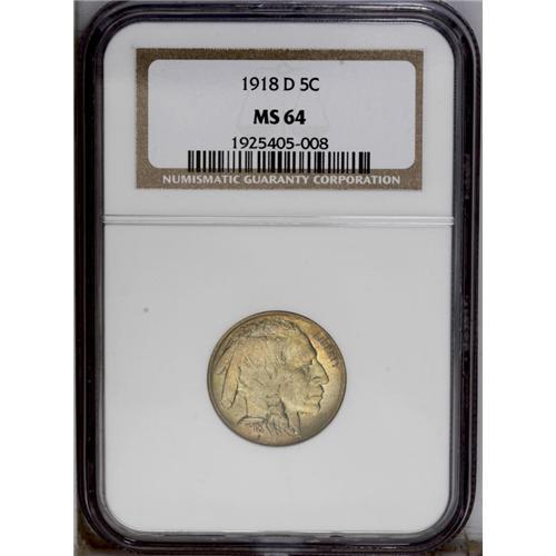 <B>1918-D<5C> MS64 NGC.</B></I> This is an important opportunity for the collector to acquire a near-Gem example. This is an elusive date any finer than the present example. Highly lustrous satin surfaces are enhanced by vivid green and gold color. <BR><BR><B>Important notice:</B> Heritage usually auctions material at the rate of 200-250 lots per hour. On some occasions eBay Live bid software or the Internet may not be able to keep up with the pace of the auction. We recommend placing a realistic absentee bid now as insurance to avoid disappointment. Occasionally the auctioneer may eliminate or reject an eBay Live bid, and the auctioneer may also reopen a lot after the close of the eBay live bidding (usually because we missed an audience bid), and may reject your bid even if it shows you as the winning bidder. By bidding via eBay Live, you agree that Heritage may award the lot to another bidder at its sole discretion under the circumstances described above or any other reasonable circumstances. Since eBay bids are not shown to us until we open the lot on the floor, we treat those bids just like floor bids. In most cases the floor responds before the eBay bid is presented to us, due to Internet lag time, so for consistency we have made it a policy that floor bids are always considered first over tie eBay live bids. Also please note that all Heritage lots purchased through eBay Live carry a 20% Buyer's Premium. Please make sure you read the Terms and Conditions before you bid. This lot is being auctioned in conjunction with a live floor auction by Heritage Galleries & Auctioneers. All final auction and invoice information will be supplied by Heritage Galleries & Auctioneers, and all other information should be considered preliminary. Lot:1056 <BR><BR><B>Winning Notification and Billing:</B> After the FINAL session in this auction is complete, Heritage will send e-mail and snail mail invoices. This process normally takes several days. All final auction and invoice information will be supplied by Heritage Galleries & Auctioneers, and all other information should be considered preliminary. <BR><BR>This auction will be conducted on a live auction floor and over the Internet through eBay Live. If you choose to place an absentee bid, please take a moment to <font color='#0000ff'><u><a href='http://pages.ebay.com/liveauctions/help/before/laabsentee.html'>learn how eBay Live absentee bidding works</a></u></font><font color='#000000'>