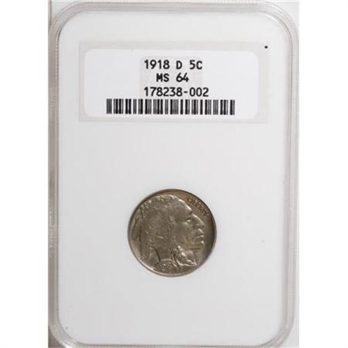 <B>1918-D 5C MS64 NGC.</B></I> Well struck except for the hair above the braid and the bison's shoulder. The lower left reverse has a minor lamination, as made. In an older generation holder.<BR><BR><B>Coin Engraver:</B> James E. Fraser<BR><BR><b>Shipping:</b> Coins & Currency (<a target="_blank" href="http://www.heritageauctions.com/common/shipping.php">view shipping information</a>)