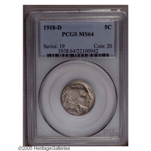 <B>1918-D<5C> MS64 PCGS.</B></I> A lustrous silver-gray near-Gem with impressively unmarked surfaces and a typical central strike. The late obverse die state affects the upper half of LIBERTY, as made. A conditionally rare early branch mint issue.